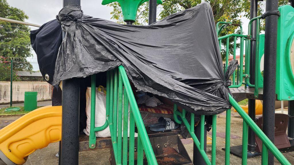 Slides where children once squealed with laughter are now draped with tarpaulin, a mattress wedged between the rails, and occupied by a homeless man. Residents say watching the park’s heart—the children’s play area—transform into a makeshift shelter has been deeply distressing.